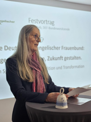 Nach den Grußworten hielt die Bundesvorsitzende ihre Festrede mit dem Titel „125 Jahre Deutscher Evangelischer Frauenbund – Vergangenheit bewahren, Zukunft gestalten: Der DEF im Spannungsfeld von Tradition und Transformation“. Sie zeichnete ein lebendiges Bild der Gründung des DEF im Jahr 1899 und betonte die damaligen Herausforderungen, vor denen Frauen standen. Die Vorsitzende hob hervor, wie der DEF im Lauf der Jahre sowohl an seinen christlichen Werten festhielt als auch die Kraft zur Veränderung bewies, um den neuen Anforderungen der Zeit zu begegnen.
