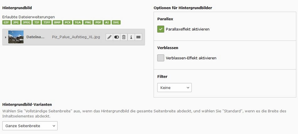 Das Bootstrap-Package ermöglicht die Zuweisung eines Hintergrundbildes an ein Inhaltselement. Dabei wird das Hintergrundbild einem zusätzlich generiertem Container zugewiesen. Die Implementation erlaubt die Verwendung verschiedener Bildgrössen in Funktion der Bildschirmbreite. Die damit verbundene Konfiguration wurde so angepasst, dass Hintergrundbilder auch dann eingesetzt werden können, wenn dem Inhaltselement kein Rahmen zugewiesen wurde.